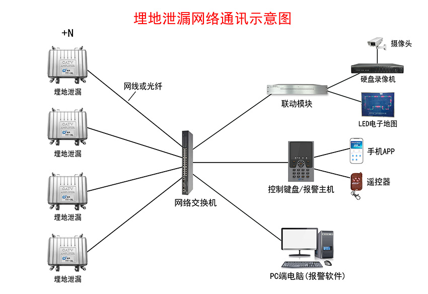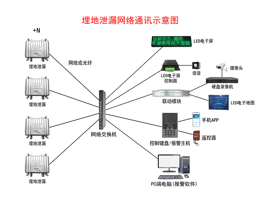 埋地泄漏入侵報(bào)警系統(tǒng)示意圖——網(wǎng)絡(luò)通訊+LED電子屏+語音