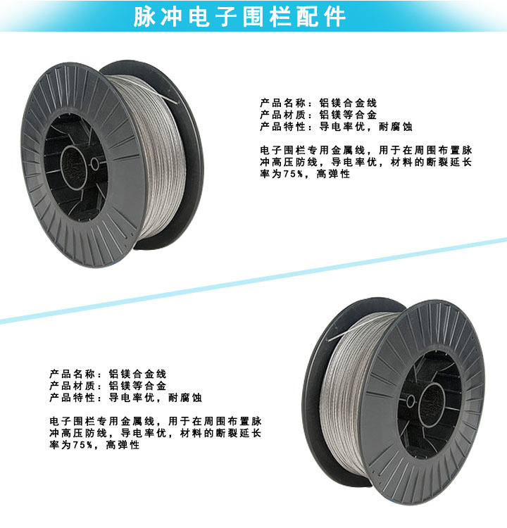 材質:鋁鎂等合金;電子圍欄專用金屬線,導電率優,耐腐蝕,用于高壓脈沖電子圍欄,材料斷裂延長率75%,高彈性